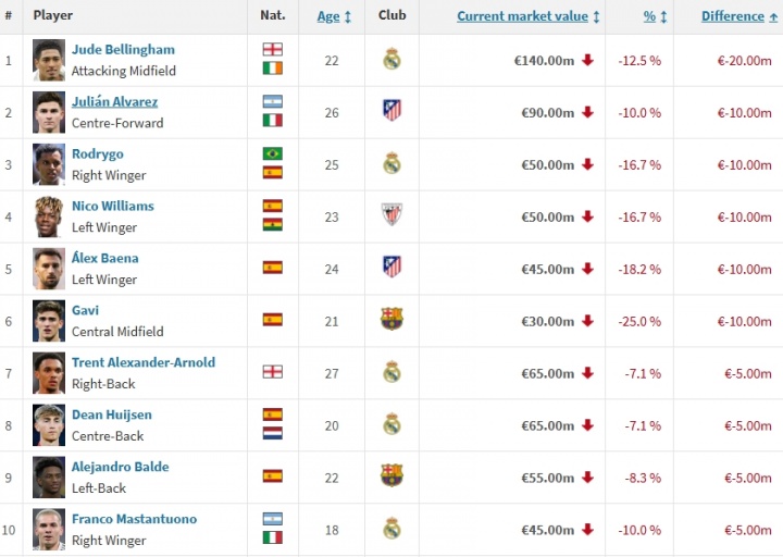 贝林厄姆(皇马):1.4亿欧(下跌2000万)
